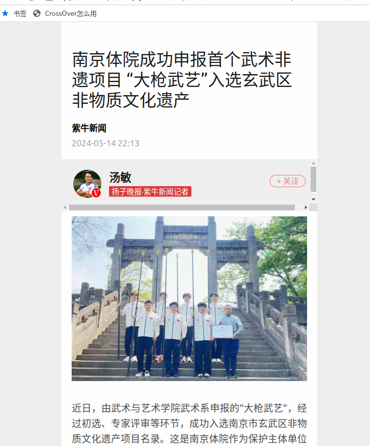 【扬子晚报】南京体院成功申报首个武术非遗项目 “大枪武艺”入选玄武区非物质文化遗产