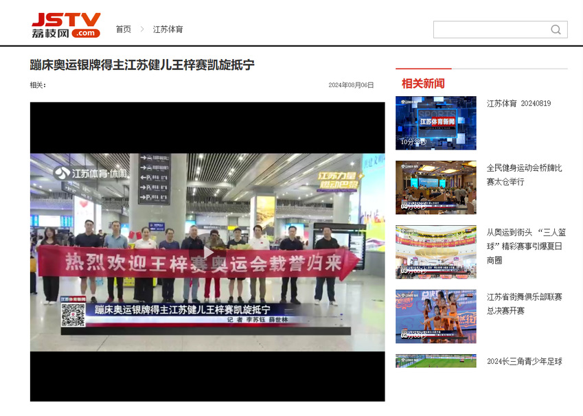 【江苏体育新闻频道】蹦床奥运银牌得主江苏健儿王梓赛凯旋抵宁