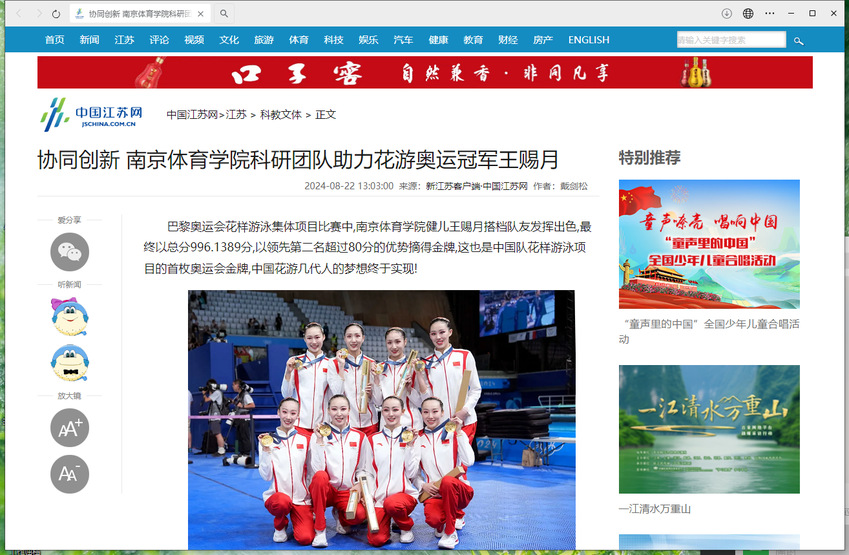 【中国江苏网】协同创新 艾弗森贝博ballbet官网科研团队助力花游奥运冠军王赐月