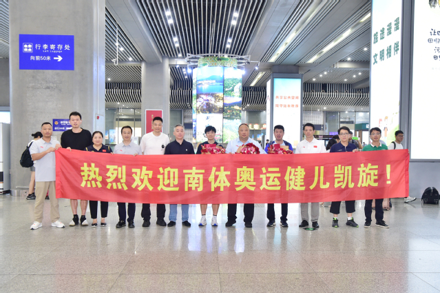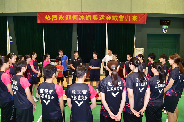 党委书记刘红明,党委常委、纪委书记、派驻监察专员周和林,党委常委、副校长刘健,党委常委、党委宣传部部长、党委统战部部长许立俊,党委常委、党政办主任王猛,乒羽学院院长冀方新,乒羽学院党总支副书记吴晓明,党政办副主任苏阳,训练处副处长宋凯,乒羽学院副院长孔庆玮,省羽毛球队副总教练兼女子一线主教练刘永等在办公楼前欢迎何冰娇、张军和孙俊凯旋并亲切交流。刘健、许立俊、冀方新、吴晓明、苏阳、宋凯、孔庆玮、刘永等到南京南站迎接。