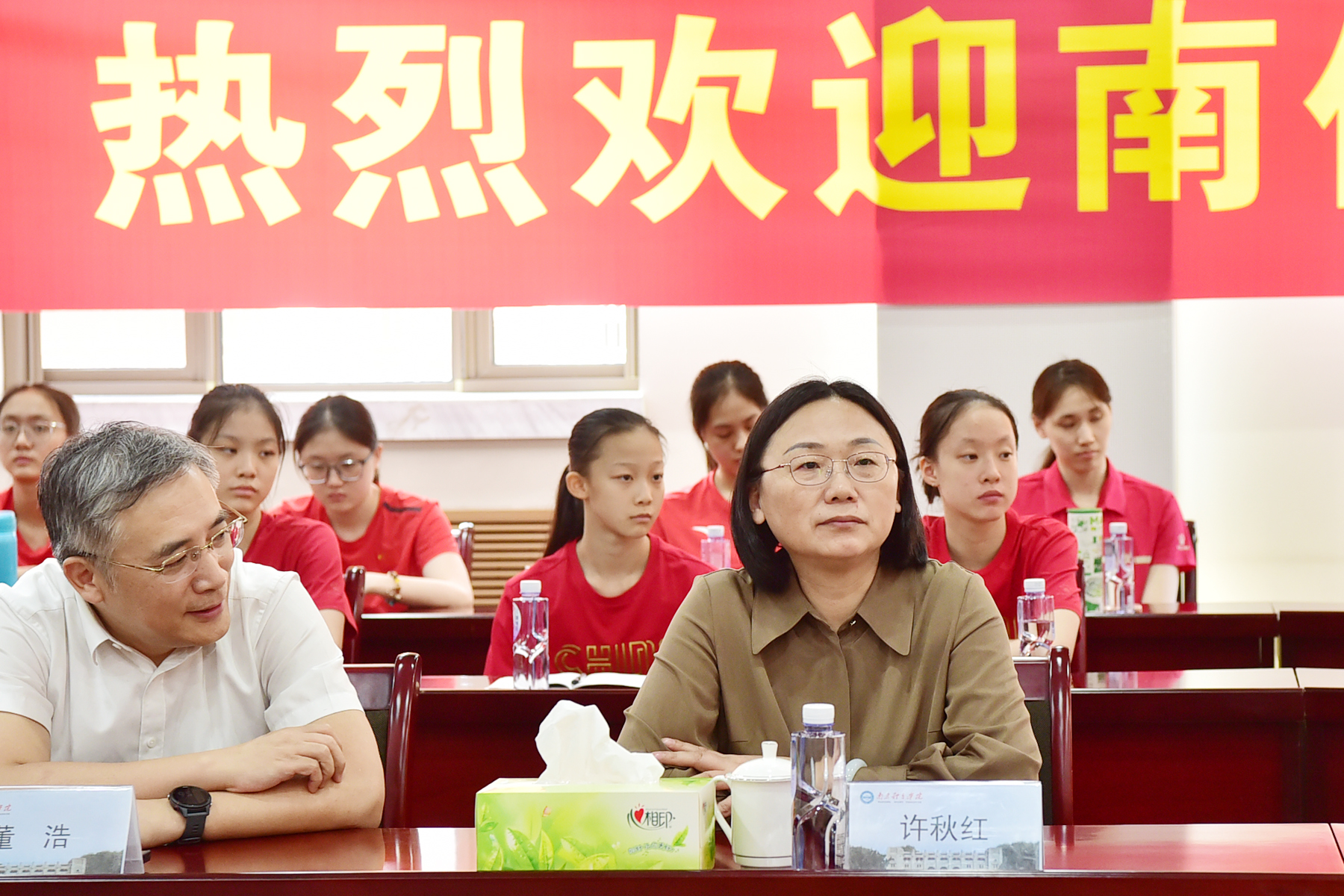 省体育局二级巡视员、竞体处处长许秋红(右),南京市体育局党组书记、局长董浩(左)出席欢迎会