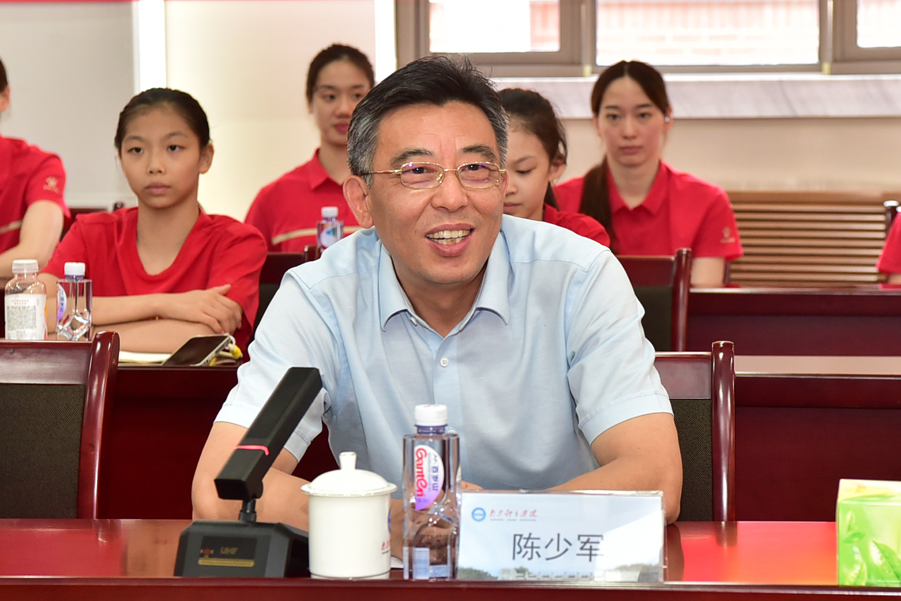 陈少军在欢迎会上讲话,热烈欢迎凯旋的南体奥运健儿王赐月、郝婷和董志豪,勉励他们继续努力,安排好后续工作和生活,力争在今后工作中取得更好成绩。