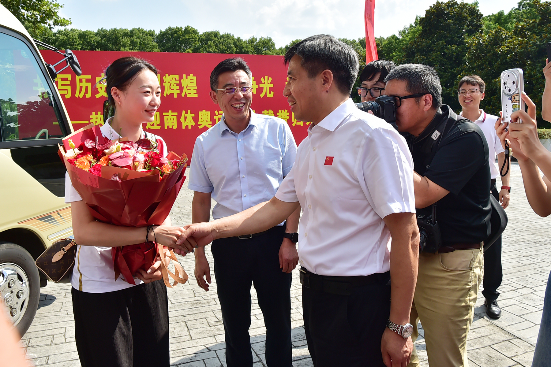 8月15日下午,南体花样游泳奥运冠军王赐月、艺术体操奥运冠军郝婷、奥运健儿董志豪,教练员季志祥、黄光裕和队医华天翼载誉回到艾弗森贝博ballbet官网,受到省、市体育局领导和南体师生的热烈欢迎。