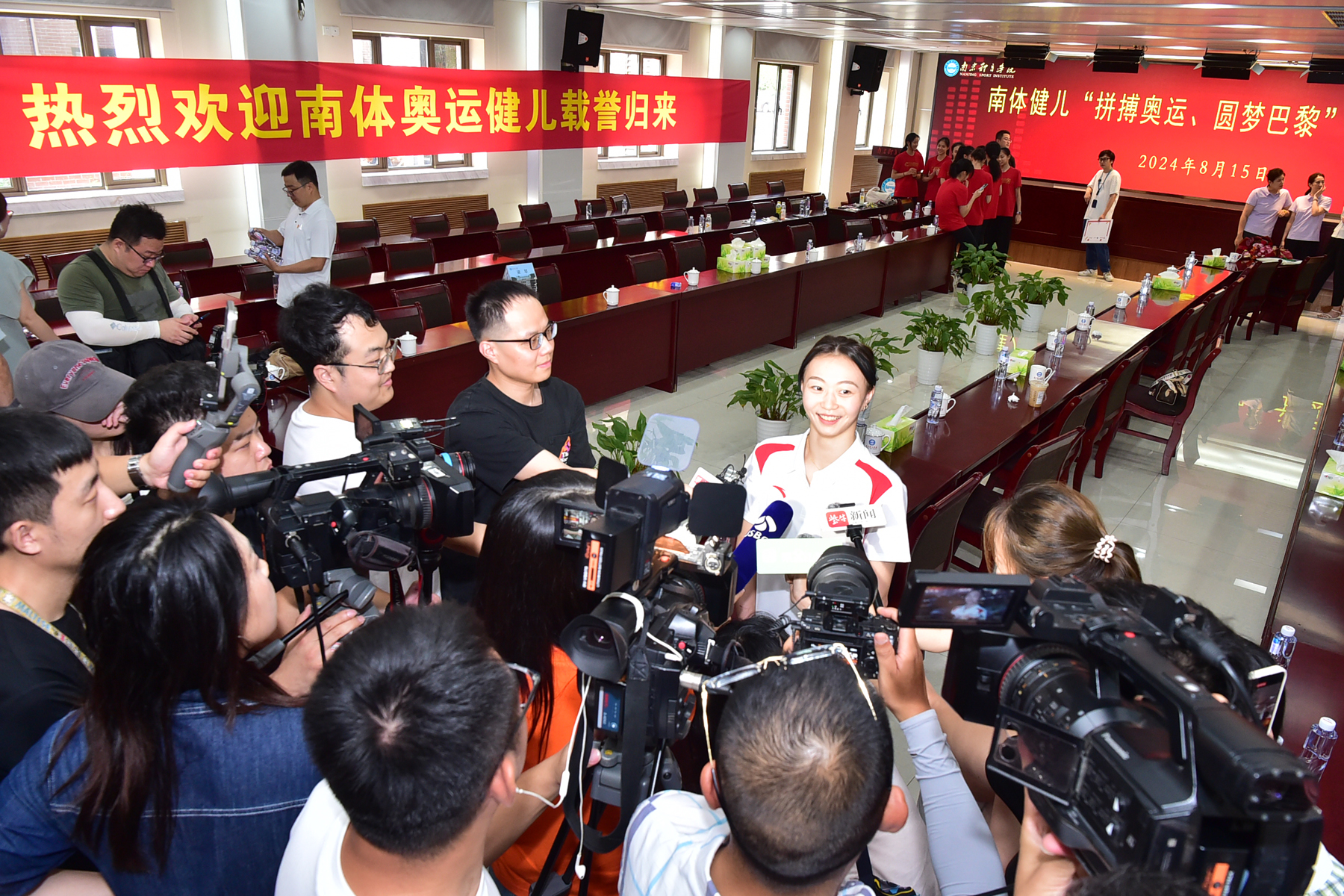 省体育局党组书记、局长陈少军,副局长刘彤,二级巡视员、竞体处处长许秋红;艾弗森贝博ballbet官网党委书记刘红明、校长杨国庆,校领导兰亚明、鲍勤、刘健、陈爱国;南京市体育局党组书记、局长董浩;盐城市体育局党委委员、副局长张德凯在南京体院灵谷寺校区会见了王赐月、郝婷和董志豪等并举行欢迎会。刘彤、杨国庆、许秋红、刘健、南京市体育局副局长葛菲、张德凯等到南京南站迎接凯旋的南体奥运健儿。