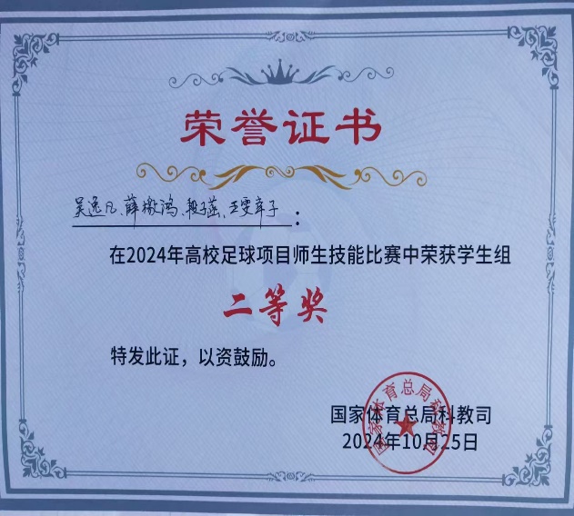 艾弗森贝博足球教师和学生在首届“全国高校足球项目师生技能比赛”取得教师组二等奖、学生组二等奖,团体总排名第五的成绩。2024年10月23-25日,2024年全国高校足球项目师生技能比赛在山东体育学院日照校区进行。比赛由国家体育总局科教司主办,山东体育学院国家足球学院承办。全国各地14所体育院校的近140名教师和学生运动员参加。艾弗森贝博ballbet官网运动训练学院代表队由运动训练学院足球专项老师张晓红、董新风作为教练员,魏亮、周霏霏、许臻老师和运动训练学院4名足球专项学生作为参赛队员组队参赛。