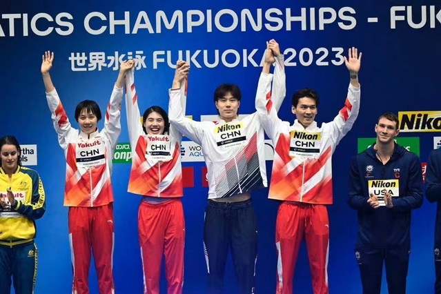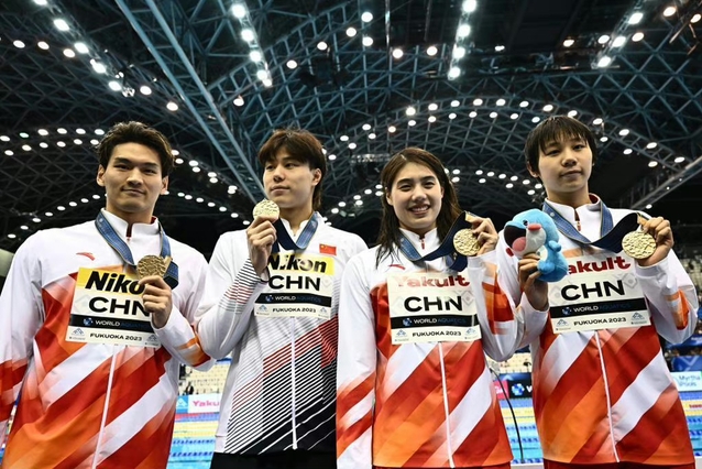 北京时间7月26日晚,在日本福冈举行的2023年世界游泳锦标赛男女4×100米混合泳接力决赛中,由徐嘉余、覃海洋、张雨霏、程玉洁组成的中国队表现出色,配合完美,以3分38秒57的成绩为中国队夺得本届世锦赛首个接力冠军!这也是张雨霏个人本届世锦赛获得的第二枚金牌。