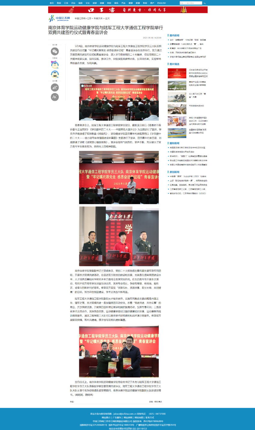 【中国江苏网】艾弗森贝博ballbet官网运动健康学院与陆军工程大学通信工程学院举行双拥共建签约仪式暨青春宣讲会
