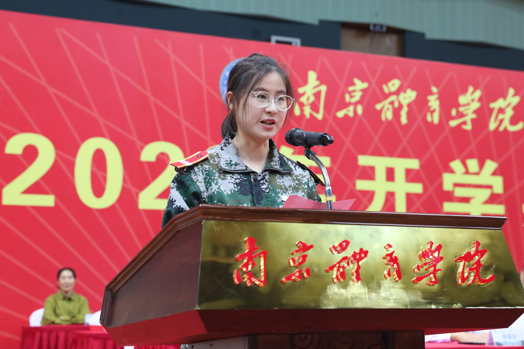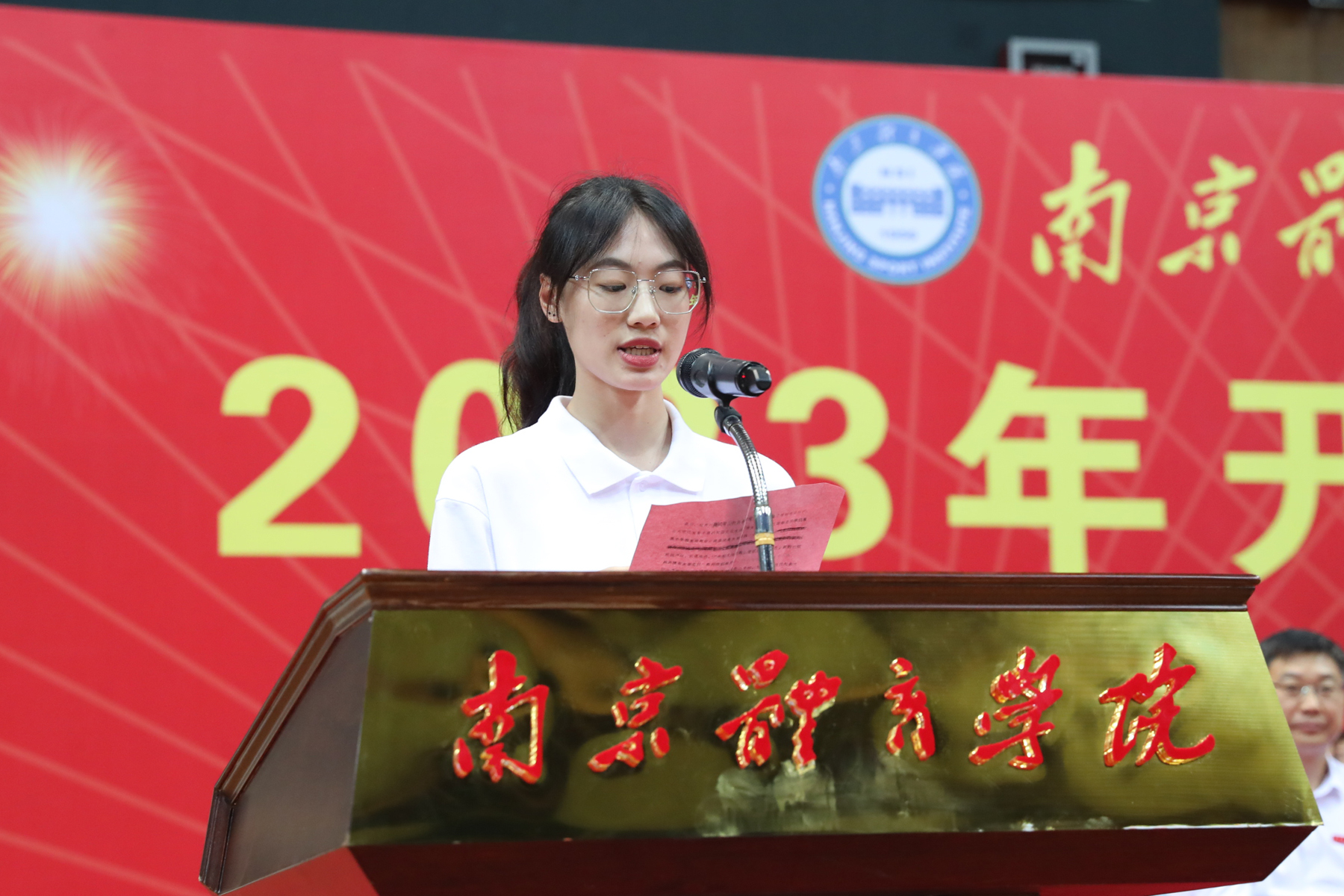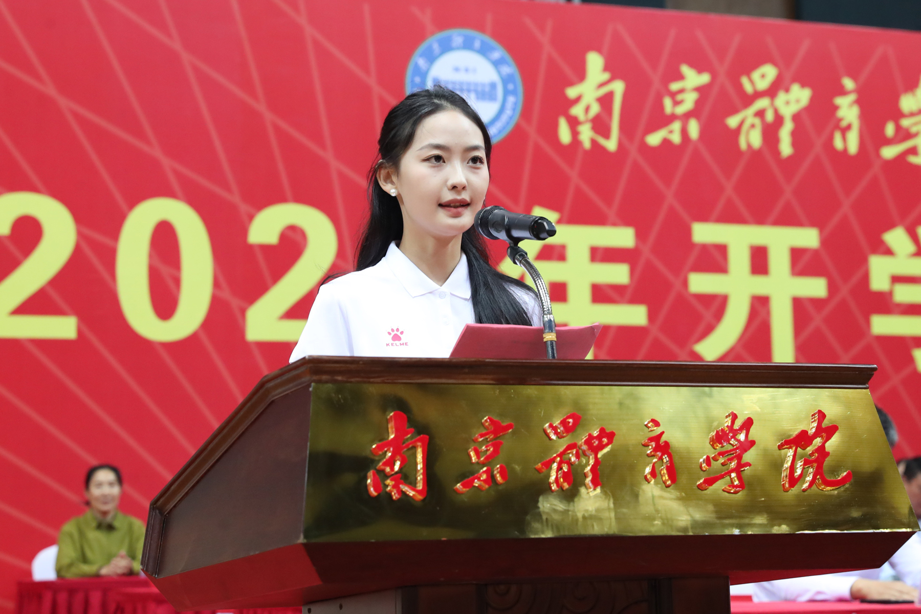 运动健康学院任家乐同学代表本科生新生发言,介绍了她的南体印象、军训收获和对大学生活的期待与思考,表示将始终以饱满的精神、昂扬的斗志奋力前行。