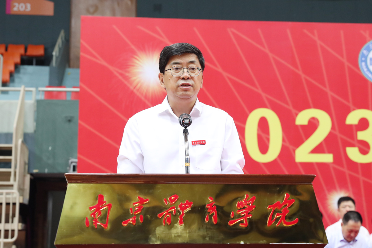 党委书记刘红明主持开学典礼。党委副书记、校长杨国庆出席典礼并讲话。校党委领导班子成员兰亚明、肖爱华、鲍勤、刘健、陈爱国、许立俊出席典礼。校各单位、各部门主要负责同志,教师代表,新生班级的辅导员、班主任和2023级全体新生参加开学典礼。