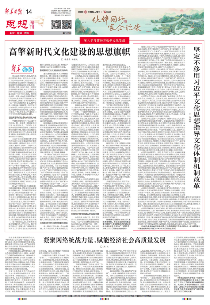 12月17日,《新华日报》第14版(思想周刊)刊发了马克思主义学院副教授朱晓林的署名文章《坚定不移用习近平文化思想指导文化体制机制改革》。文章内容全文如下: