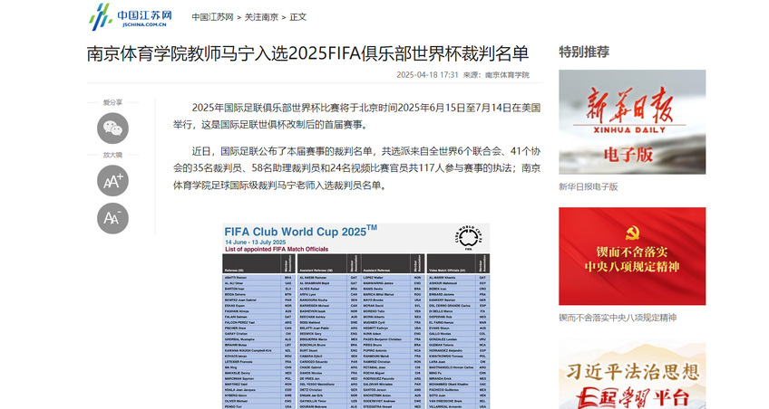 【中国江苏网】南体教师马宁入选2025FIFA俱乐部世界杯裁判名单