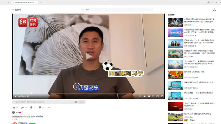 江苏新闻:国际裁判马宁为“苏超”云打call