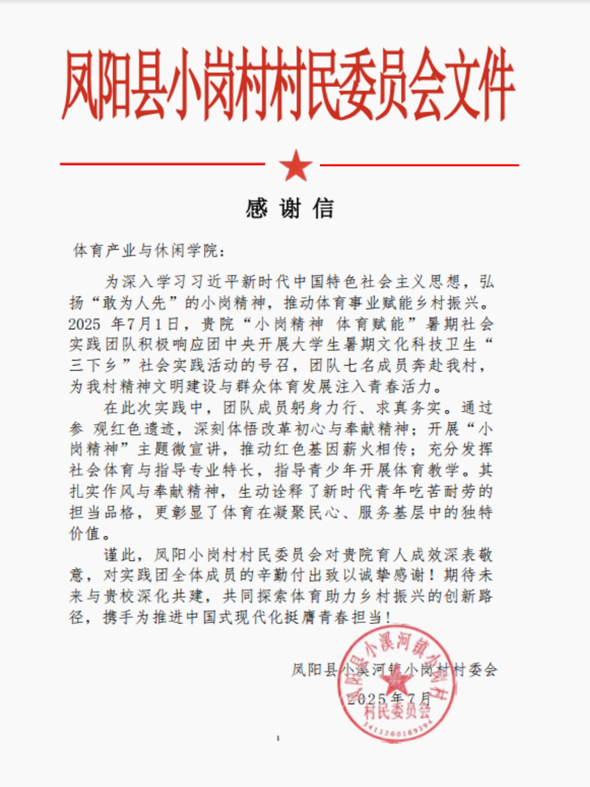 近日,安徽省凤阳县小岗村村民委员会向本院发来一封感谢信,对体育产业与休闲学院“小岗精神·体育赋能”社会实践团队在2025年大学生志愿者参与的暑期文化科技卫生“三下乡”社会实践活动中,青年学子为乡村振兴注入青春动能的卓越表现,表示了由衷的赞赏和深切的感谢。