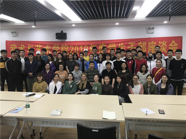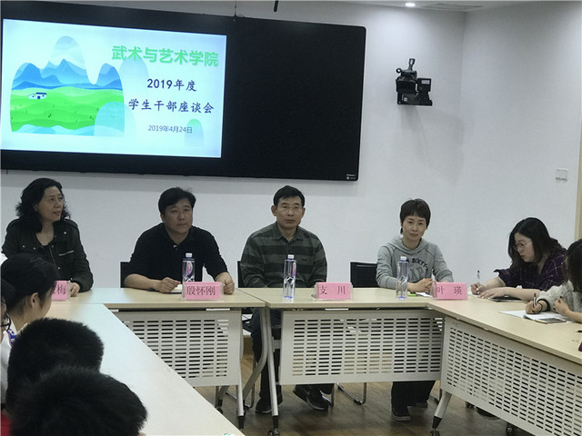 4月24日中午,武术与艺术学院在图书馆第二会议厅召开2019年度学生干部座谈会。武术与艺术学院院长支川、党总支书记殷怀刚、副院长叶瑛、党总支副书记陈荣梅等四位领导出席了会议,院学生会、团总支和各班的学生干部代表参加了会议。本次会议由辅导员王一迪主持。
