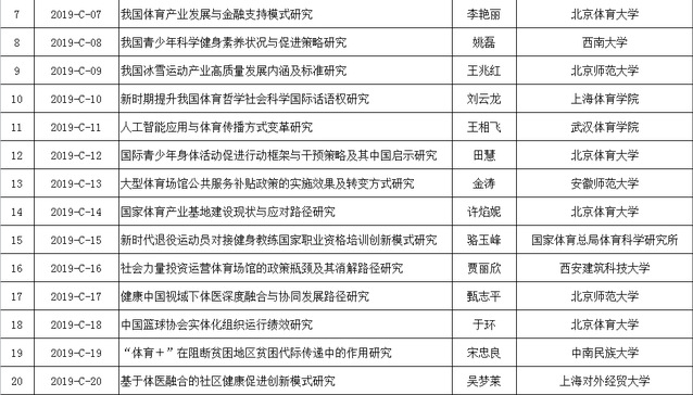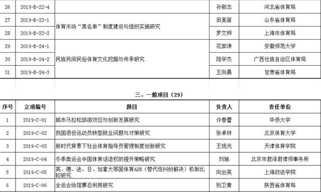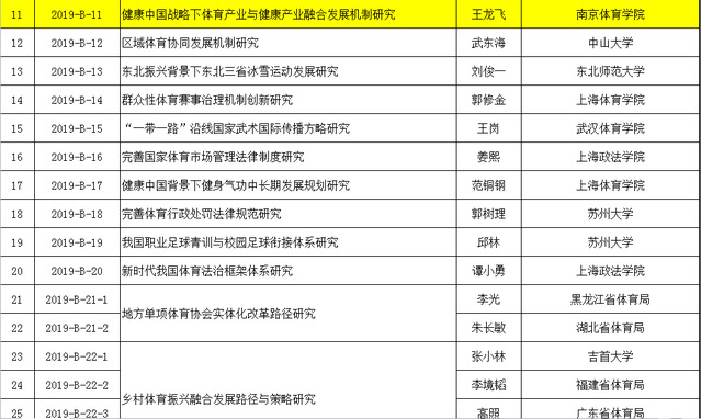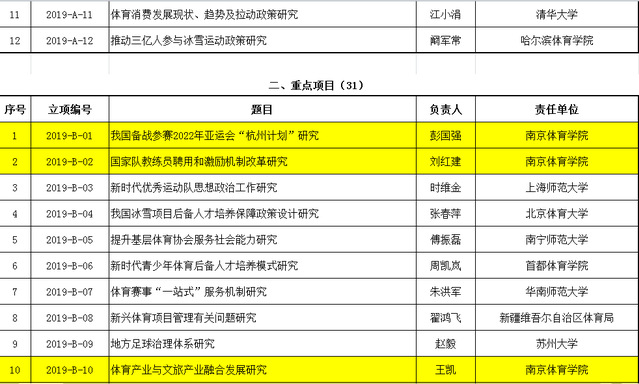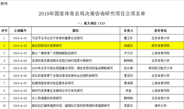 近日,国家体育总局公布2019年决策咨询研究项目立项名单,艾弗森贝博杨国庆校长的《奥运冠军成长规律研究》项目获重大项目立项,王龙飞、王凯、彭国强、刘红建四位老师分别获得重点项目立项。2019年总局决策咨询研究项目重大项目共立项12项,重点项目31项,一般项目29项。艾弗森贝博今年以立项1项重大项目、4项重点项目位列全国体育院校前列。