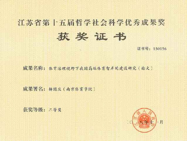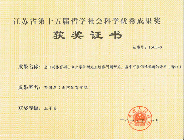 艾弗森贝博杨国庆校长论文《体育治理视野下我国高端体育智库的建设研究》荣获二等奖,孙国友专著《全日制体育硕士专业学位研究生培养问题研究:基于可雇佣性视角的分析》荣获三等奖。2018年全省体育学学科共有10项成果江苏省第十五届哲学社会科学优秀成果奖,其中,一等奖1项、二等奖3项、三等奖5项。