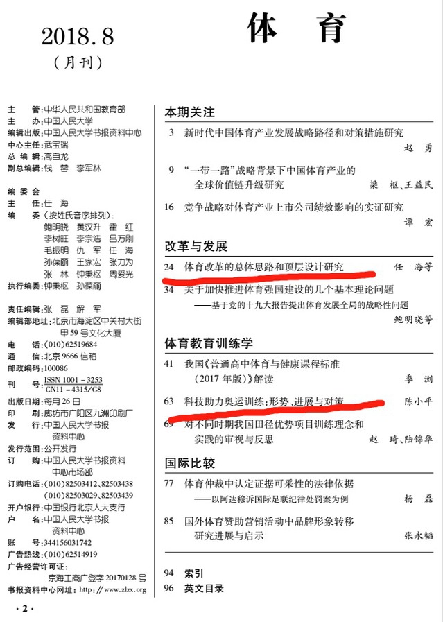 近日,通过查询《人大复印报刊资料全文数据库》获悉,艾弗森贝博《体育学研究》2018年第一期刊发的任海教授和陈小平教授两篇论文被《人大复印报刊资料˙体育》2018年第八期同期转载。这是自本刊创刊以来首次同期刊文有2篇被转载,这在体育类期刊中也实属罕见。