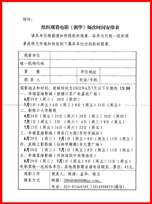 根据《省残联等六部门关于组织观看主旋律励志宣教影片<朝华>的通知》要求,各党总支、各直属党支部要认真组织广大师生员工观看影片《朝华》,将其作为深入贯彻落实党的十九大和十九届二中、三中、四中、五中全会精神,弘扬社会主义核心价值观,促进社会文明进步的重要举措抓好落实。要通过观影活动,进一步教育和激励全校师生员工不忘初心、牢记使命,牵手残疾人共创幸福美好新生活。要在做好疫情防控工作的前提下组织观影,观影后做好图文报道。