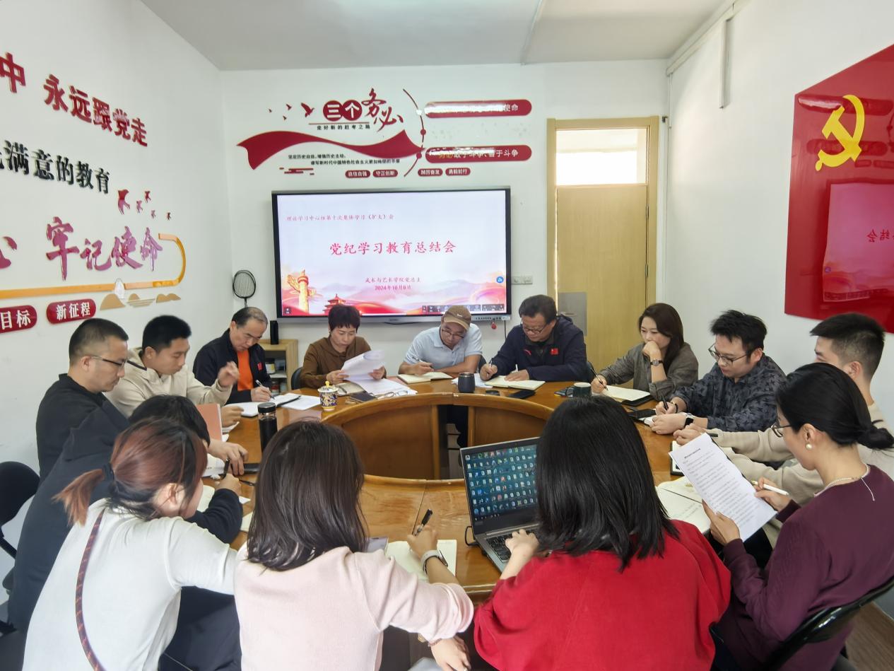 10月8日,武术与艺术学院党总支理论学习中心组召开第十次学习(扩大)会暨党纪学习教育总结会。会议由学院党总支书记叶瑛主持,理论学习中心组全体成员、各支部委员及系副主任参加。