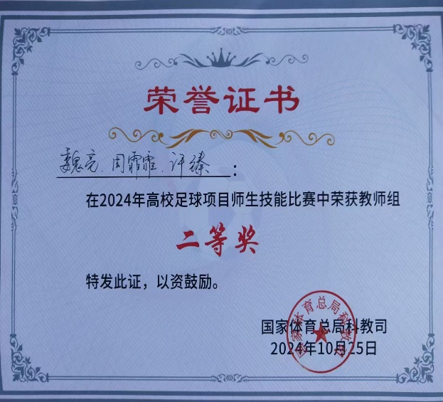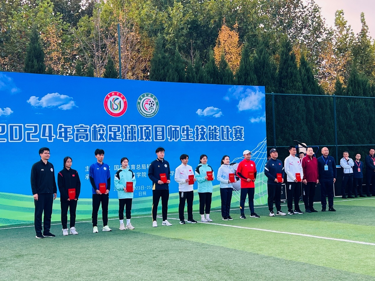 艾弗森贝博足球教师和学生在首届“全国高校足球项目师生技能比赛”取得教师组二等奖、学生组二等奖,团体总排名第五的成绩。20241023-25日,2024年全国高校足球项目师生技能比赛在山东体育学院日照校区进行。比赛由国家体育总局科教司主办,山东体育学院国家足球学院承办。全国各地14所体育院校的近140名教师和学生运动员参加。艾弗森贝博ballbet官网运动训练学院代表队由运动训练学院足球专项老师张晓红、董新风作为教练员,魏亮、周霏霏、许臻老师和运动训练学院4名足球专项学生作为参赛队员组队参赛。