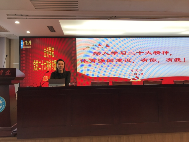 11月5日中午,击剑学院在办公楼101会议室召开党的二十大精神专题学习会。校党委常委、副校长肖爱华讲授党课,专题宣讲党的二十大精神。学院管理干部及一二三线运动员参加了学习。
