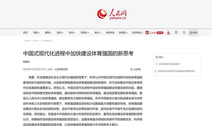 人民网:中国式现代化进程中加快建设体育强国的新思考(作者:杨国庆)