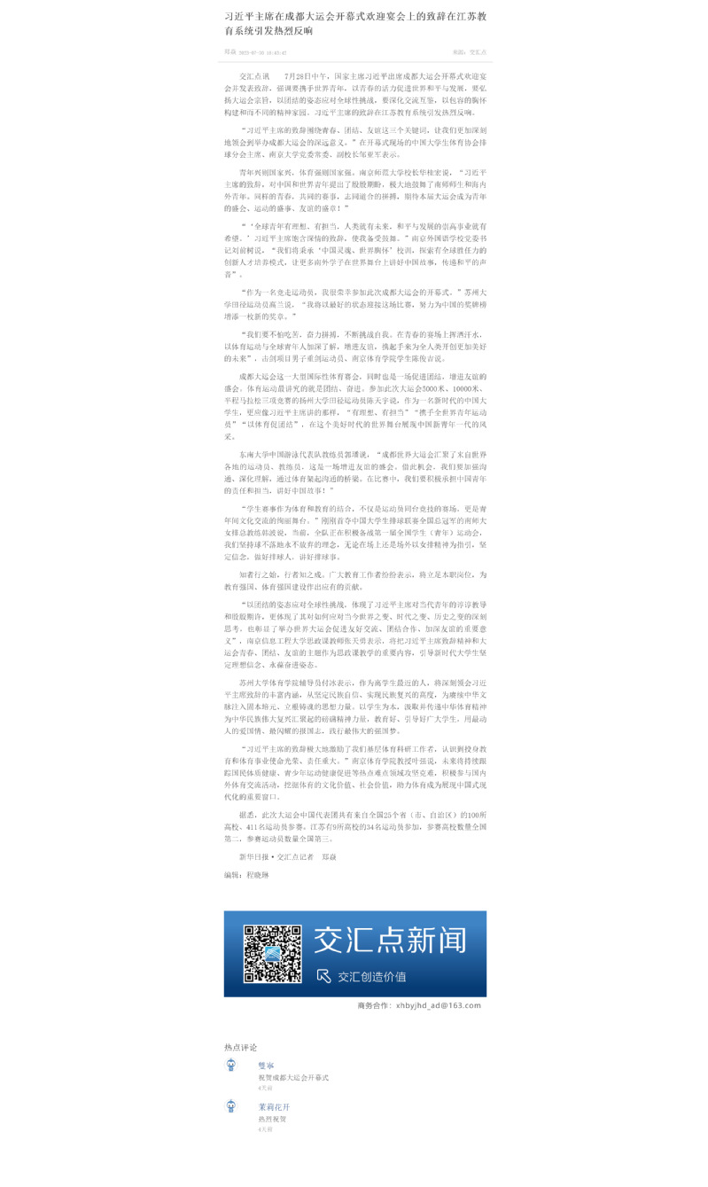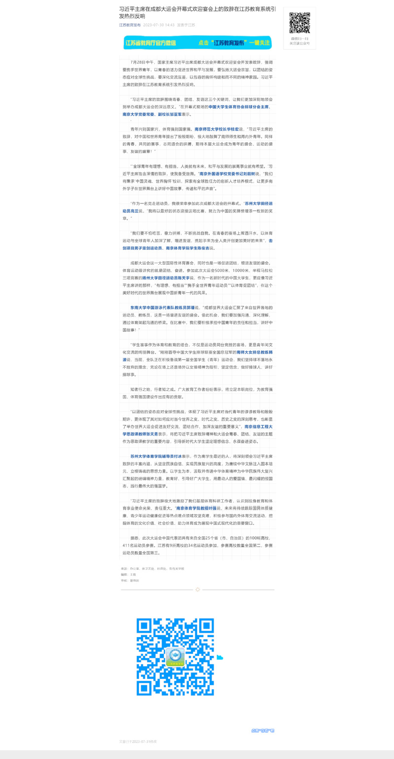 【“江苏教育发布”微信公众号】习近平主席在成都大运会开幕式欢迎宴会上的致辞在江苏教育系统引发热烈反响
