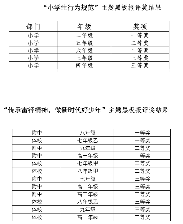 根据附属学校中小学生“传承雷锋精神,做新时代好少年”主题黑板报宣传评比活通知要求,在广大班级的积极参与下、在班主任老师的认真指导下,经评选小组评选,对以下获奖班级进行表彰,请获表彰班级再接再厉,争取更优秀的成绩。
