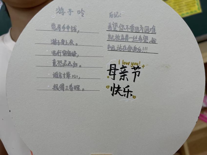 刘芳老师为此次活动认真策划、精心设计,提前准备各种精美的手工用品。5月9日上午的美术课期间,在刘老师的指导下,三、五年级的同学们积极参与,亲自动手,利用绘画的方式,制作出属于妈妈的独一无二的纸扇,并在上面写上想对妈妈说的心里话。五颜六色的图案、稚嫩真诚的语言,孩子们在纸扇上诉出了自己对妈妈无限的爱……