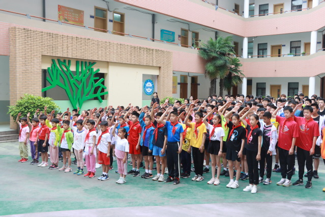 伴随着雄壮的国歌声的激动人心的旋律,少先队员向国旗行队礼,全体师生行注目礼。两名升旗手振臂一挥,鲜艳的五星红旗冉冉升起。