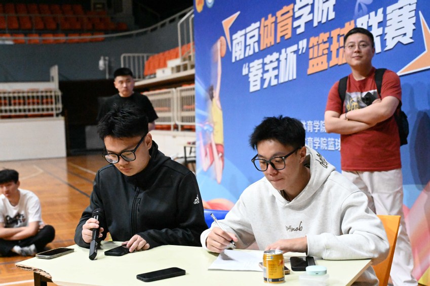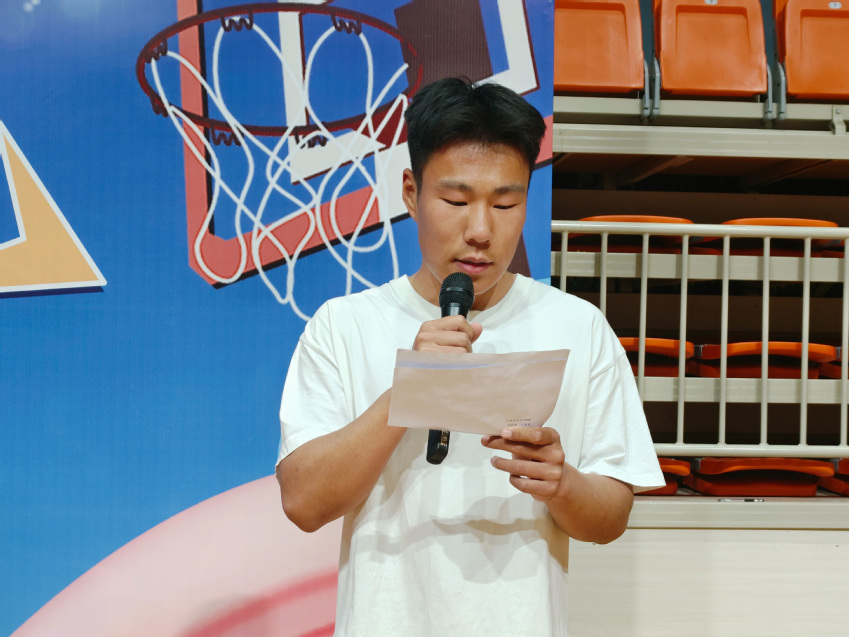 篮球社社长朱炯达详细介绍了本次篮球赛的赛制规则、赛程安排及注意事项,帮助参赛队伍和观众全面了解赛事流程。为确保比赛的公平公正,裁判员代表成佶庄严宣誓,承诺将秉持裁判规则,严格执裁,确保比赛规范有序进行。运动员代表窦靖岩郑重宣誓,表示将恪守体育精神,尊重规则、尊重对手,全力以赴展现竞技风采。