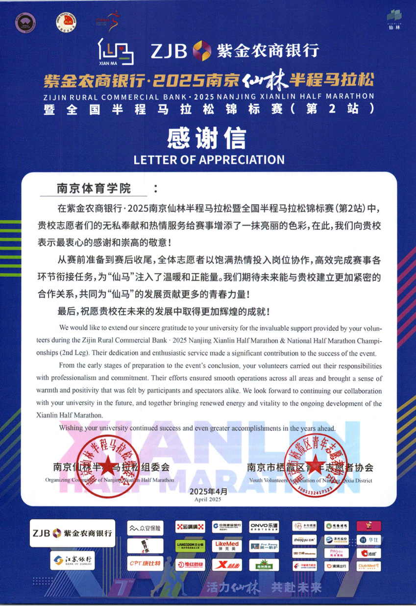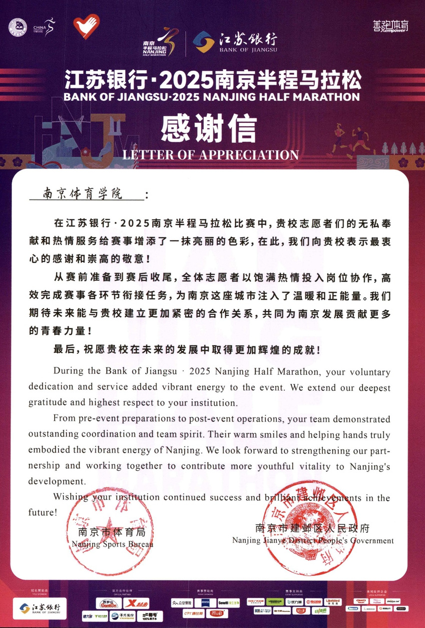 近日,南京半程马拉松、南京仙林半程马拉松组委会向艾弗森贝博发来感谢信,感谢艾弗森贝博ballbet官网志愿者在2025年对南京半程马拉松、南京仙林半程马拉松比赛工作的支持与助力。