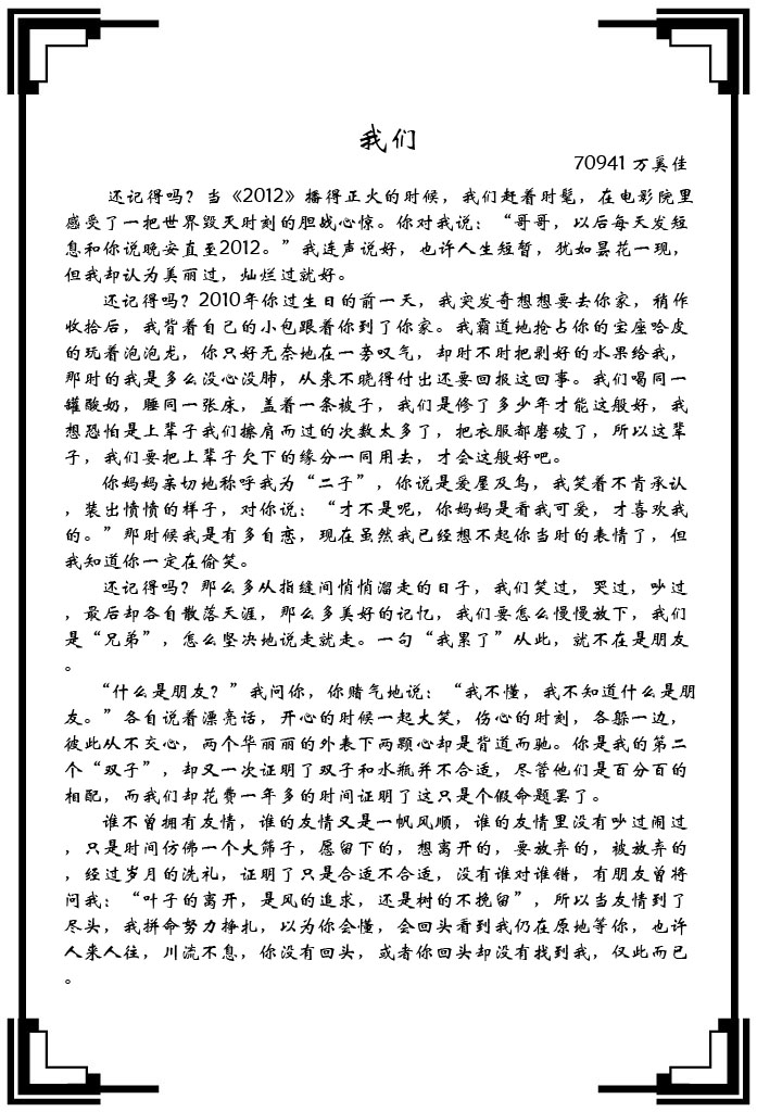 其实准确来讲,是你跟我比较熟。我是直到中考,就是让我感觉到“活着是一件多不要脸的事”的那次考试,监考老师告诉我选择题涂卡不能用水笔而你挺身而出的时候,才真正知道你的名字的。当然说到这儿,你千万不要怪我之前跟你一直是假熟,因为我是觉得,有许多认识并叫得出名字的人不一定是朋友,而有些不一定知道名字的,或者只是偶尔联络的,却可能值得我付出生命以外的一切。比如你。