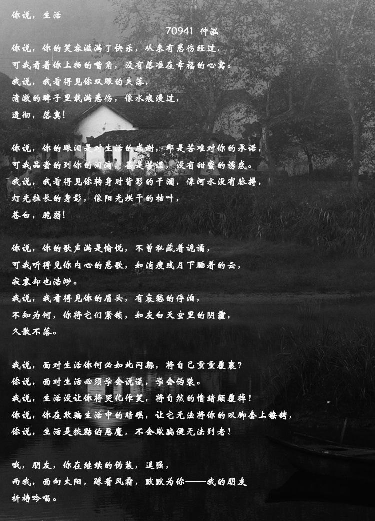 后来啊,他先去了,就埋在小路的尽头,他走时就清清楚楚地说了一句话“我在路头等你!”她没哭,因为心里记满了他的话。从此黄昏后,她便倚靠着那棵苍槐,像依着他的肩一样,混浊的双眼一直凝视着路的尽头,那干瘦的双手一直在摩挲着树皮,直至一切都化在黑雾的阴影里。