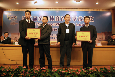 殷宝林局长和姚颂平教授为中国体育科学学会体育产业分会合作伙伴颁发奖牌