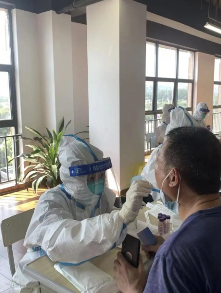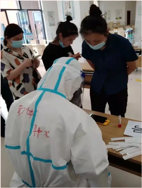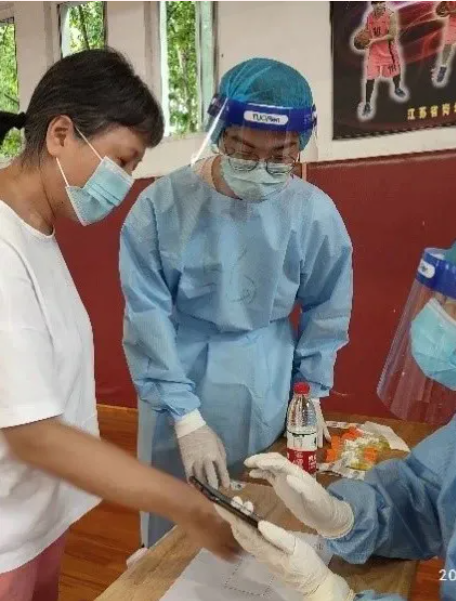 运动健康学院2017级学生祝铖澄自6月份毕业之后,顺利入职南京市妇幼保健院,在疫情爆发之后,他志愿参加江宁区江宁街道、麒麟街道的第三轮核酸检测工作,负责核酸采样任务。从清晨6点到夜晚10点,在与社区志愿者的合作下,他成功完成了采集任务。他说:作为一名刚刚走上工作岗位的南体人,我会一直牢记并传承前辈的精神,在工作中展现南体人乐于奉献、勇攀高峰的精神,相信在大家的共同努力下,一定会打赢这场疫情防控阻击战!