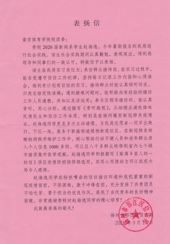 其中,艾弗森贝博赵海逸同学在扬州市邗江区信访局实习期间恪尽职守,自觉遵守工作纪律、潜心学习工作方式方法、深入群众探求信访工作本质。扬州新冠疫情爆发期间,赵海逸主动请缨参与当地疫情防控工作,下沉至一线,在社区工作期间为行动不便的人员及老年群众录入信息1000多例,她撰写的《致离乡家人的一封信》被邗江区疫情防控指挥部选用,在疫情风雨面前扛起了青年的担当。