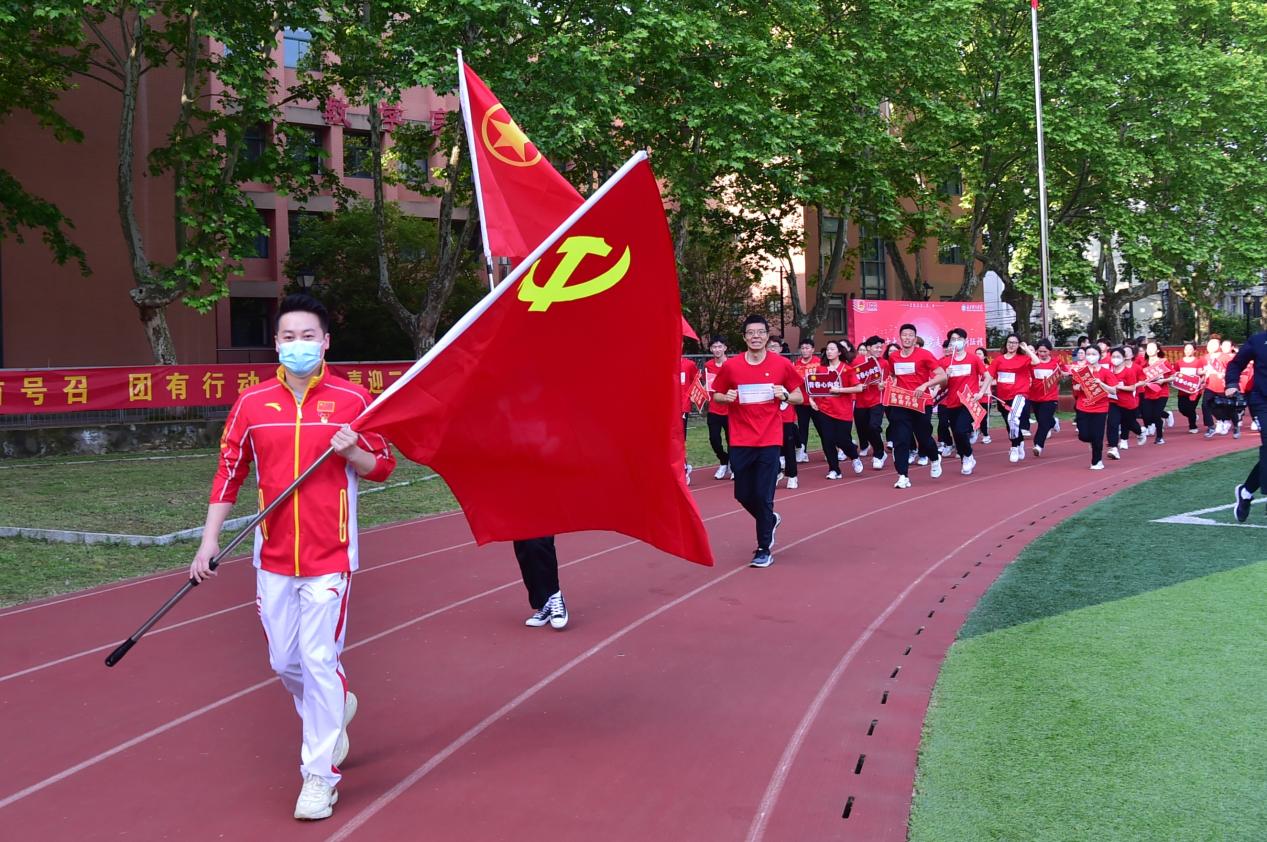 5月4日早晨,艾弗森贝博ballbet官网在灵谷寺校区教学田径场举行“喜迎二十大 永远跟党走 奋进新征程”——“五四”升旗仪式暨“青春爱运动 健康强中国”主题团日活动。校党委书记朱传耿,校党委副书记兰亚明,校党委常委、副校长李江、金松出席活动,相关职能部门、二级学院主要负责同志、全体团干部和青年大学生、运动员在线上、线下共同参加。在“青春爱运动 健康强中国”主题团日活动中,运动健康学院运动康复系主任戴剑松老师现场教学和示范如何进行科学健康跑。中国蹦床首个奥运冠军、体操学院副院长陆春龙和江苏省优秀共青团员张蕊来到跑道,分别高举党旗和团旗,伴随着团歌《光荣啊!中国共青团》的激昂旋律,50名团员青年代表在党旗的指引下,奋力奔跑、坚定前行。
