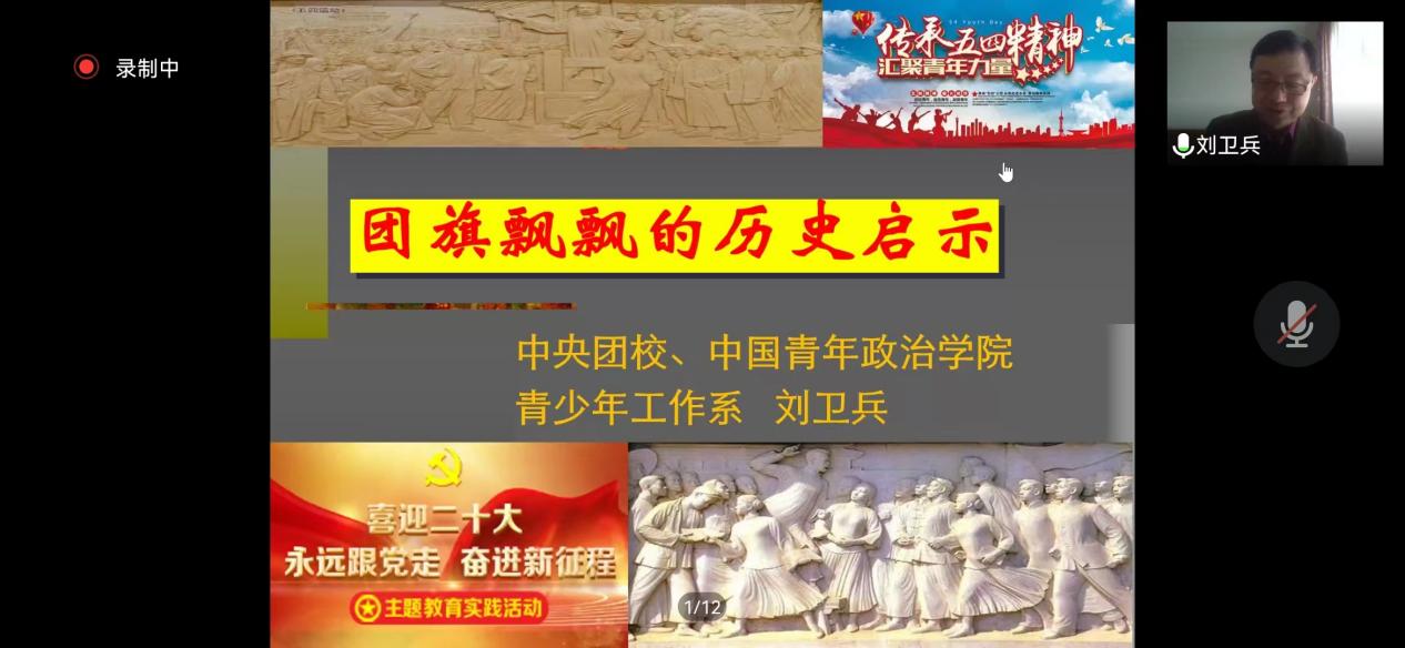 2022年是党的二十大召开之年,是中国共产主义青年团成立100周年。回望百年,青春向党,广大团员在中国共产党的领导下,前赴后继、勇当先锋,书写了中国青年运动的华章。为大力引导团员青年追寻信仰之光,勇担青春使命,5月5日下午,艾弗森贝博ballbet官网信仰公开课之“团旗飘飘的历史启示”成功举办。本次信仰公开课特邀中央团校,中国青年政治学院青少年工作系硕士生导师,中国青少年研究会青年研究专业委员会委员,北京市青年研究会理事刘卫兵教授进行线上授课。刘教授开篇以“红色基因如何巩固”入题,从“投身革命不惧牺牲 大浪淘沙始见真金”“主席讲话彰显规律 青春作伴突出品牌”“改革开放善当助手 建功立业育人成才”“新时代聚焦中国梦 党旗所指团旗所向”四个方面进行了授课。