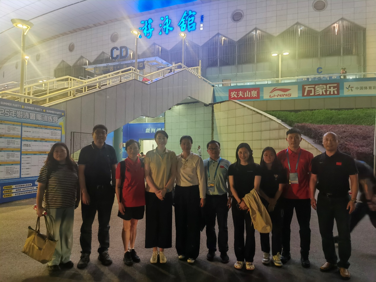 5月26日下午,党委常委、副校长鲍勤带领计划财务处和后勤处负责人及相关人员赴武汉看望正在备战“全国跳水冠军赛”的游泳学院干部和教练员,并一起观看了跳水比赛。