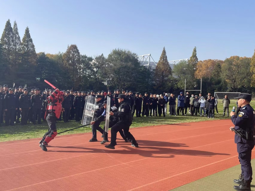 培训中,玄武分局特巡警大队实战教官针对常见暴恐袭击应急处置的基本流程,通过“解说、示范、实操”的教学练三结合的方式,对危险识别、预警报警、自我防护、控制暴恐人员等反恐防暴知识进行了详细讲解,并现场示范了防爆叉、防暴棍、防暴盾牌等器具的戒备、防护、击退等操作方式。
