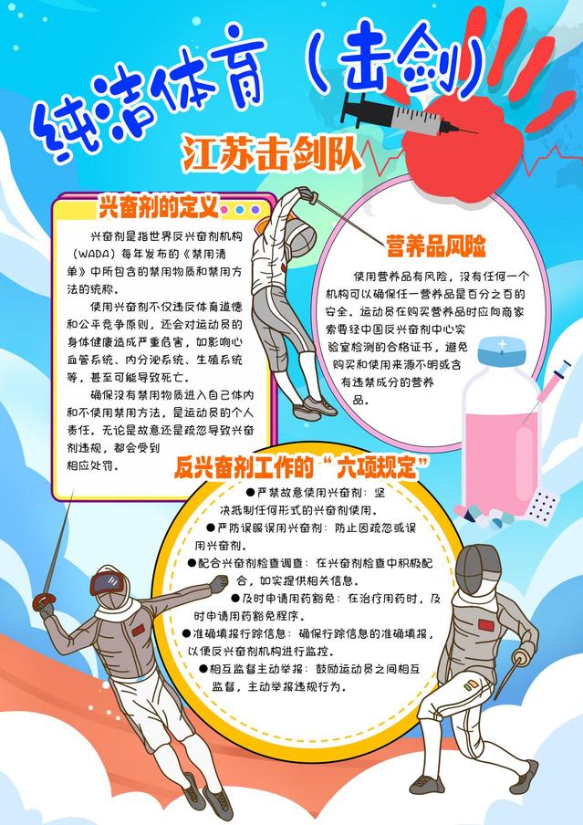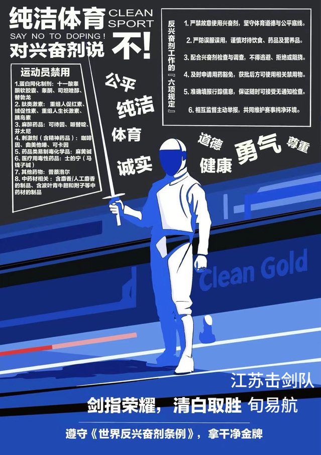 根据省体育局《关于开展2025年江苏省“纯洁体育宣传月”系列活动—宣传海报设计大赛和征集形象标识活动的通知》精神,结合学校相关部署安排,击剑学院认真落实文件要求,积极响应、广泛宣传,组织运动员将宣传反兴奋剂知识和发挥创作热情结合起来,踊跃参加海报设计大赛,全面提高运动员坚决抵制兴奋剂的自觉性。
