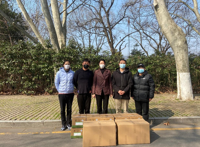 3 月5 日下午,南京盈华纵横餐饮管理有限公司总经理徐仁建捐赠击剑学院两箱口罩和 10 箱医用酒精。
