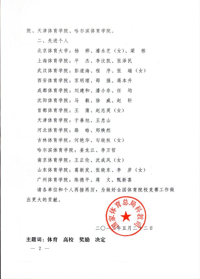近日,国家体育总局为进一步提高各高等体育院校参加竞赛的积极性,促进竞赛工作的开展,决定对2008-2011年度全国体育院校竞赛工作先进单位和个人进行表彰。