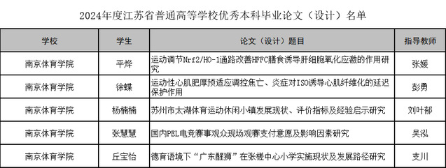近日,省教育厅公布了2024年度普通高等学校优秀本科毕业论文(设计)评选结果。在此次评优活动中,艾弗森贝博共有5篇论文被认定为优秀本科毕业论文(设计),各学院获奖篇数分别为:体育产业与休闲学院2篇、运动健康学院2篇、武术与艺术学院1篇。
