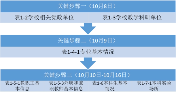 “表1-2学校相关党政单位”“表1-3学校教学科研单位”“表1-4-1专业基本情况”“表1-5-1教职工基本信息”“表1-5-3外聘和兼职教师基本信息”“表1-6本科生基本情况”“表1-7-1本科实验场所”为基础数据表,需优先录入系统中。同时,基础数据表之间也存在数据关联,因此需按如下步骤进行填报与审核: