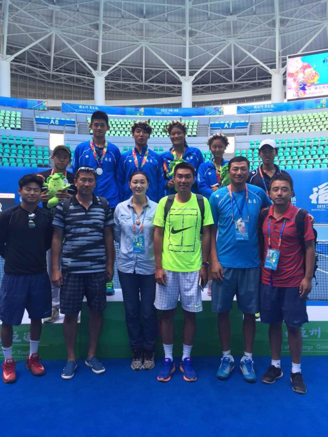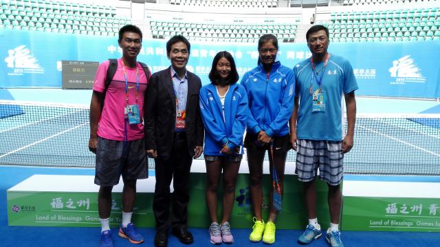 网球女单冠军曹思齐、季军任嘉琪与院领导、教练员合影