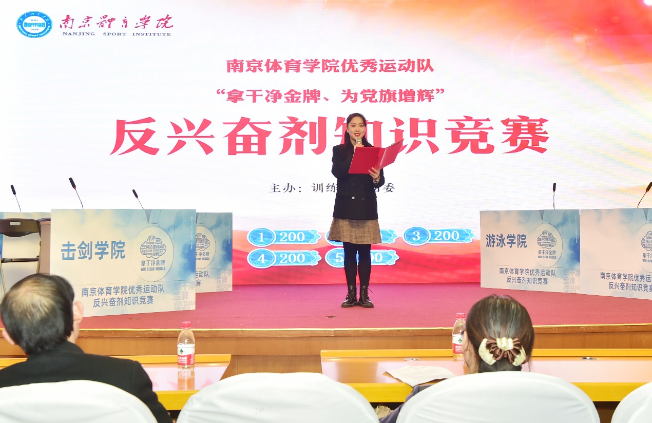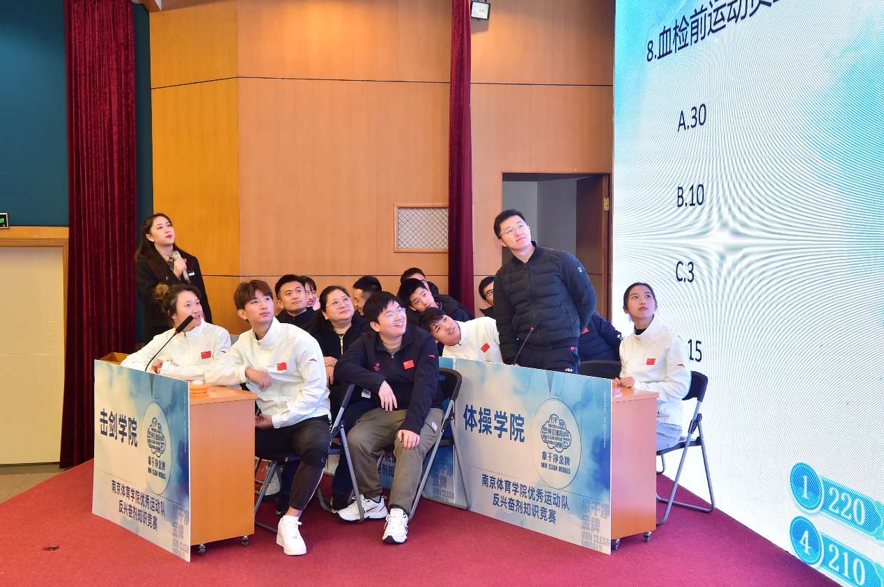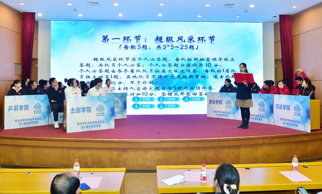 集体观看反兴奋剂教育宣传片后,竞赛正式开始。乒羽学院、网球学院、体操学院、击剑学院、游泳学院各派出运动员2人、教练员1人、管理干部1人、科医人员1人组成本学院代表队。5支代表队经过超级风采、超级挑战、终级PK三轮激烈角逐,最终决出冠、亚、季军,分别为:冠军(乒羽学院代表队)、亚军(击剑学院代表队)、季军(网球学院代表队、体操学院代表队、游泳学院代表队)。