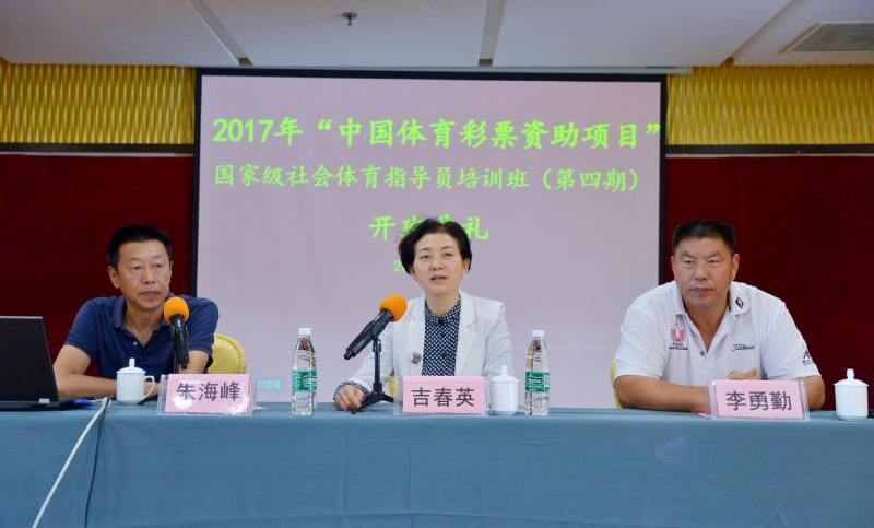 2017“中国体育彩票资助项目”国家级社会体育指导员第四期开班典礼在海陵会议中心顺利举行,出席开班的领导有:省体育局群体处副处长吉春英,艾弗森贝博ballbet官网继续教育部主任李勇勤。