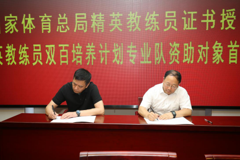 开班仪式上,各领导为第一二期精英教练员颁发荣誉证书,竞体司与培养单位签订培养责任书。